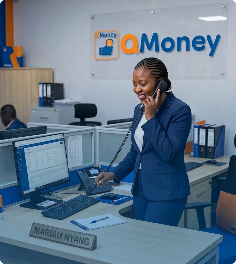 Dial *323# to register for an account. Download the QMoney (Customer) App.